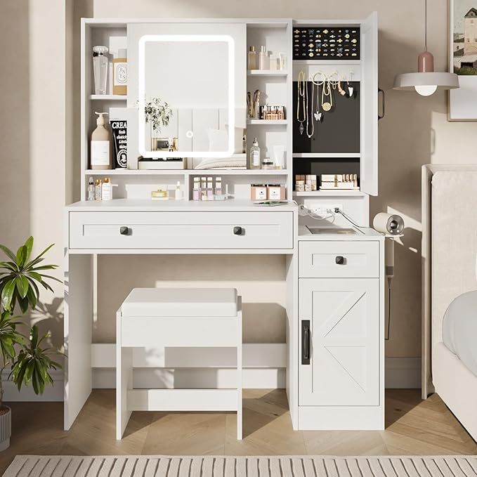 VEANERWOOD White Vanity Desk Set with Sliding Lighted Mirror, Makeup Vanity Table Set with Jewelry Cabinet, Stool & Large Drawer
