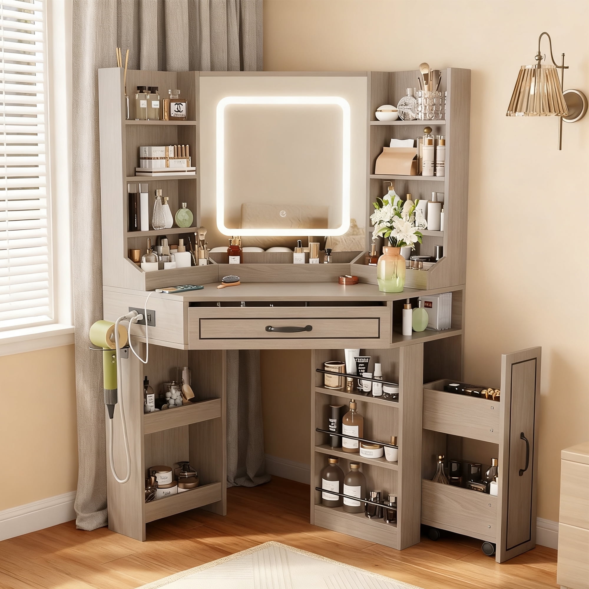 VEANERWOOD Large Corner Vanity Desk with Tri-fold Mirror and Lights, Farmhouse Corner Makeup Vanity Table with Charging Station, 2 Cabinets, Drawers & Adjustable Shelves