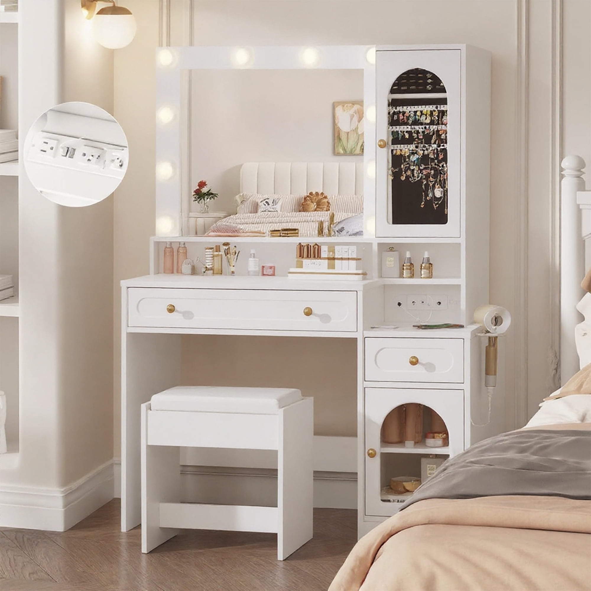 VEANERWOOD Modern Vanity Desk Set with 3 Color Lighted Mirror, Makeup Table with Jewelry Cabinet, Glass Doors Soft Stool and Charging Station, White