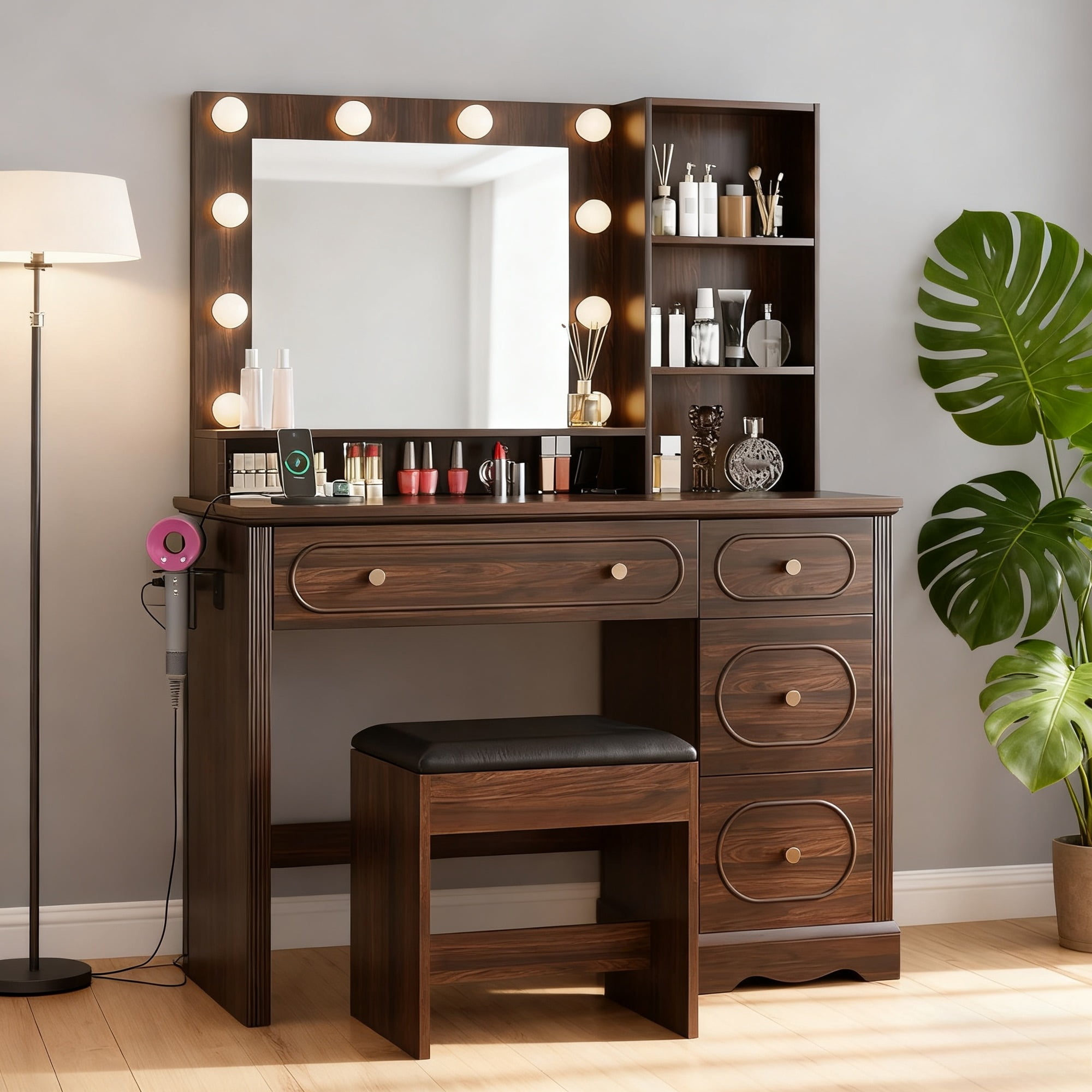 VEANERWOOD Vintage Makeup Vanity Set with Mirror and Lights, Wood Vanity Table with Stool Chair & Charging Station and 4 Drawers, Dressing Table for Bedroom, Walnut Grain