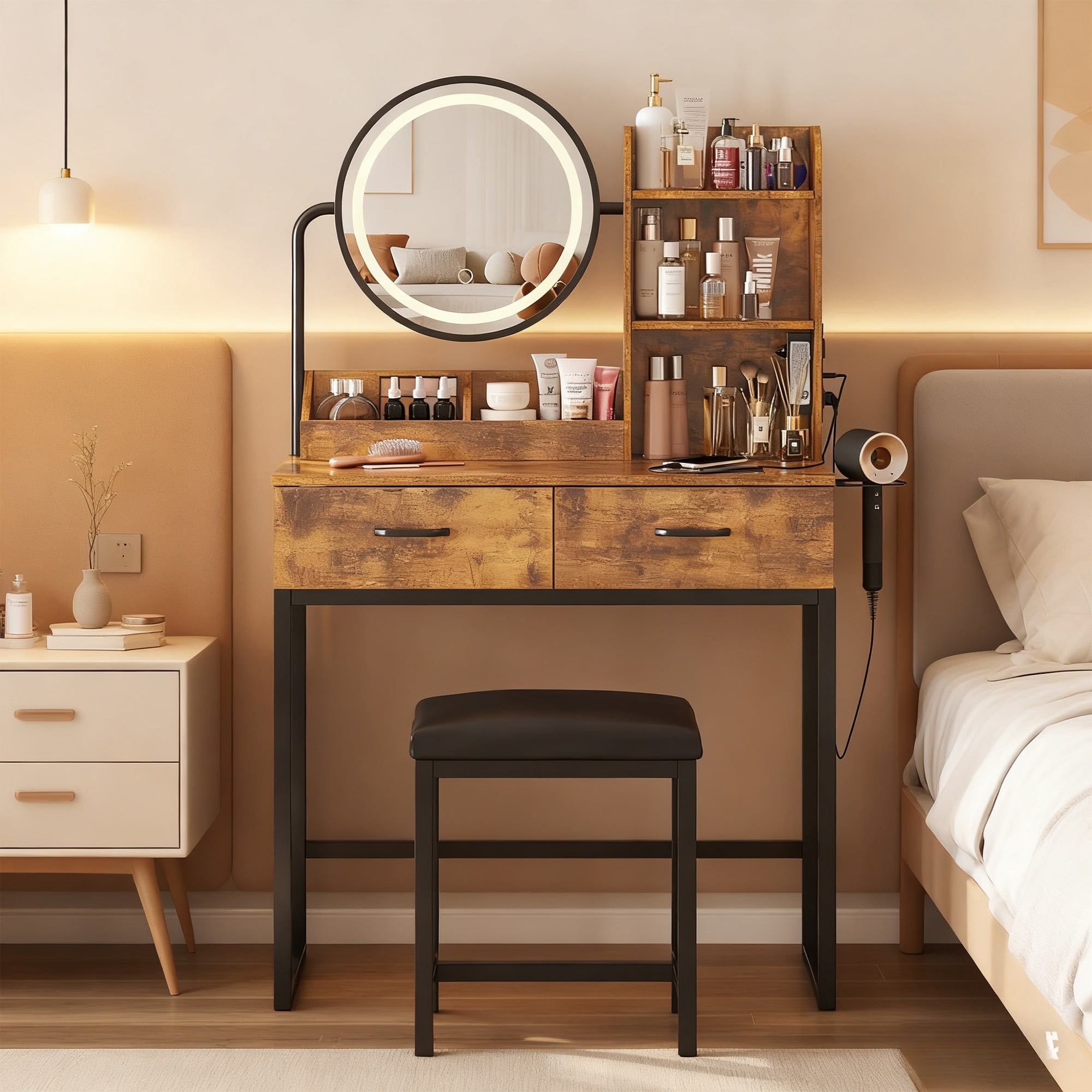 Vabches Makeup Vanity with Round Mirror and Lights, White Vanity Makeup Table with Charging Station, Small Vanity Table for Bedroom, 3 Lighting Modes, 31.5in(L)