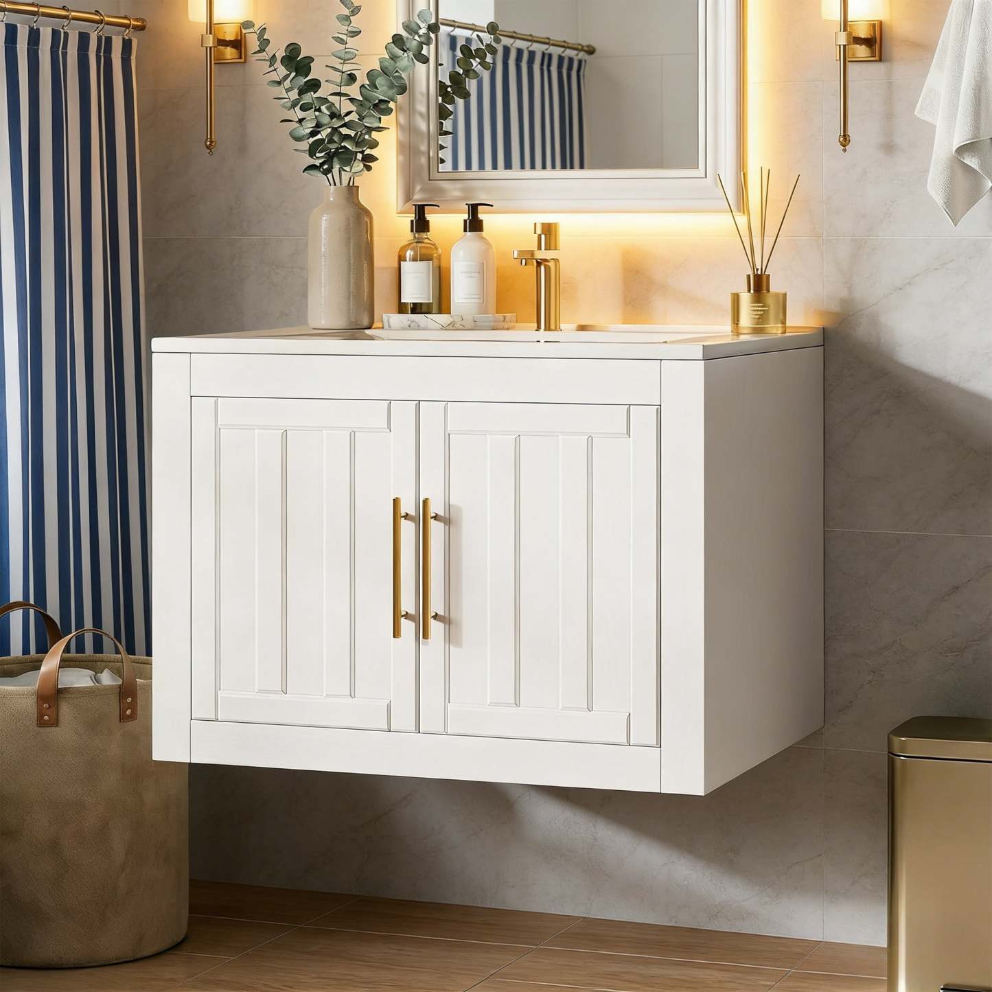 Vabches 24" Floating Bathroom Vanity Set, Wall Mounted Bathroom Cabinet with Ceramic Sink and Metal Handles, Modern Wooden Cabinet for Small Space, White(Not Faucet)