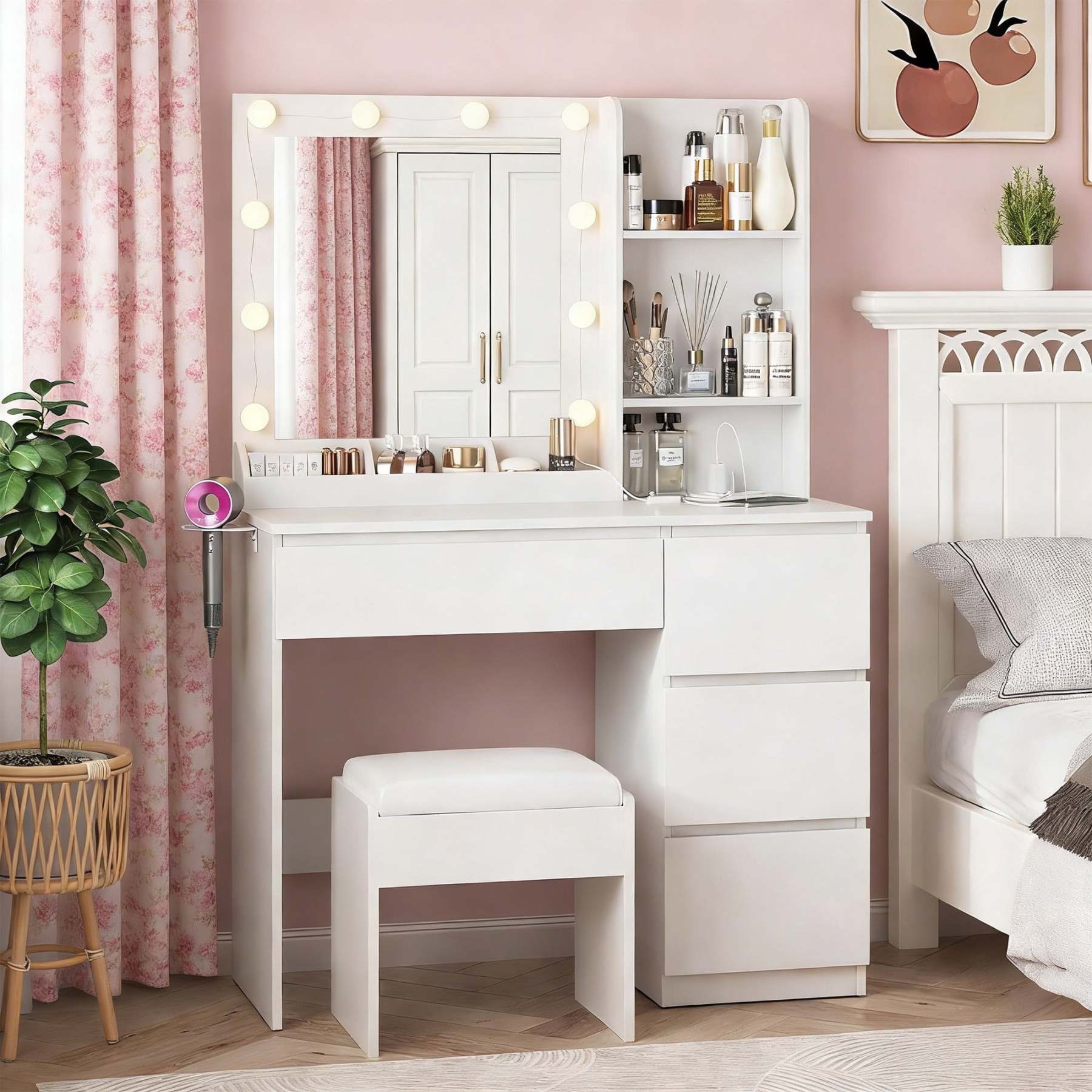 Vabches 37"W Vanity Set with Lights and Mirror, Makeup Vanity Table with 4 Drawers and Charging Station & Stool, 3 Lighting Colors, White