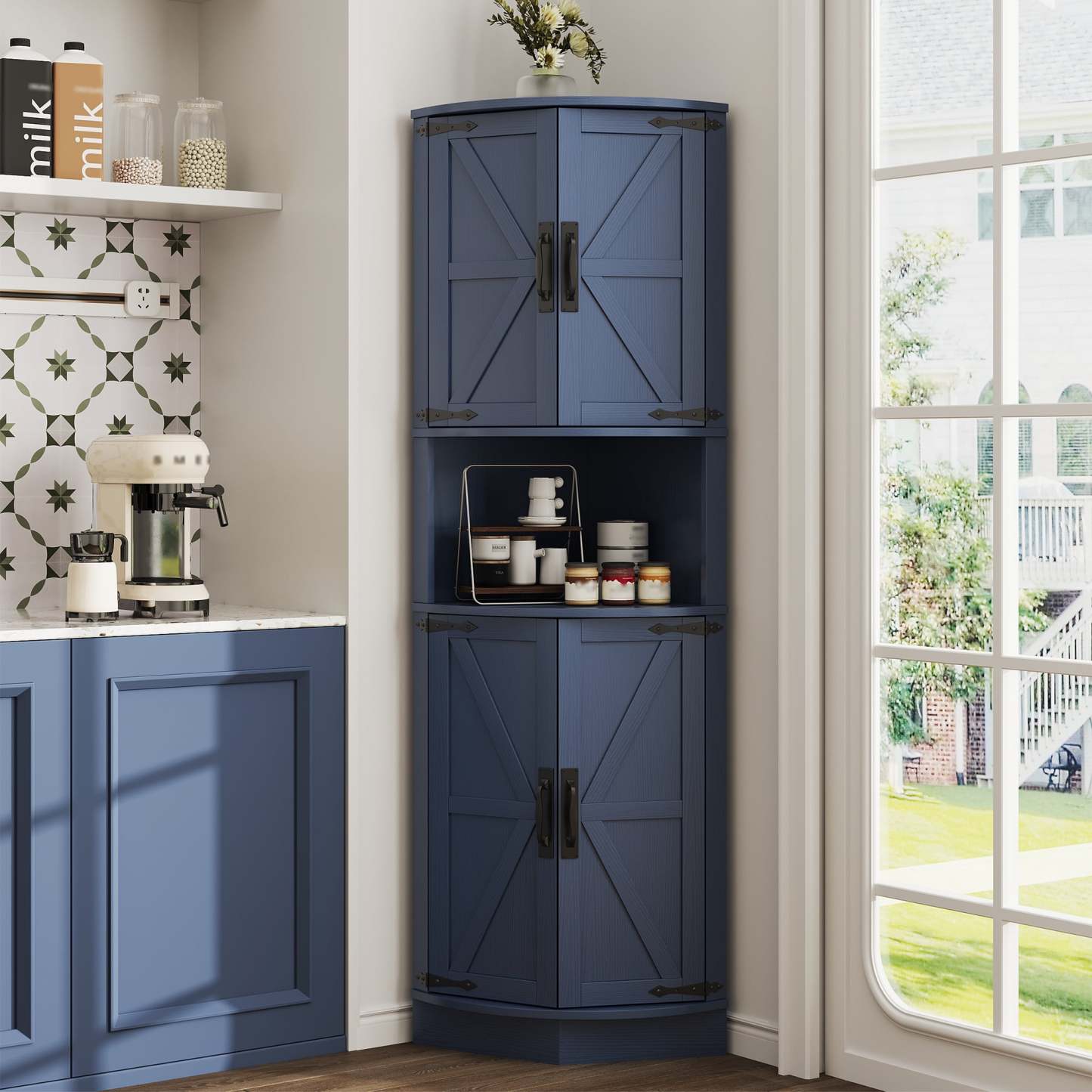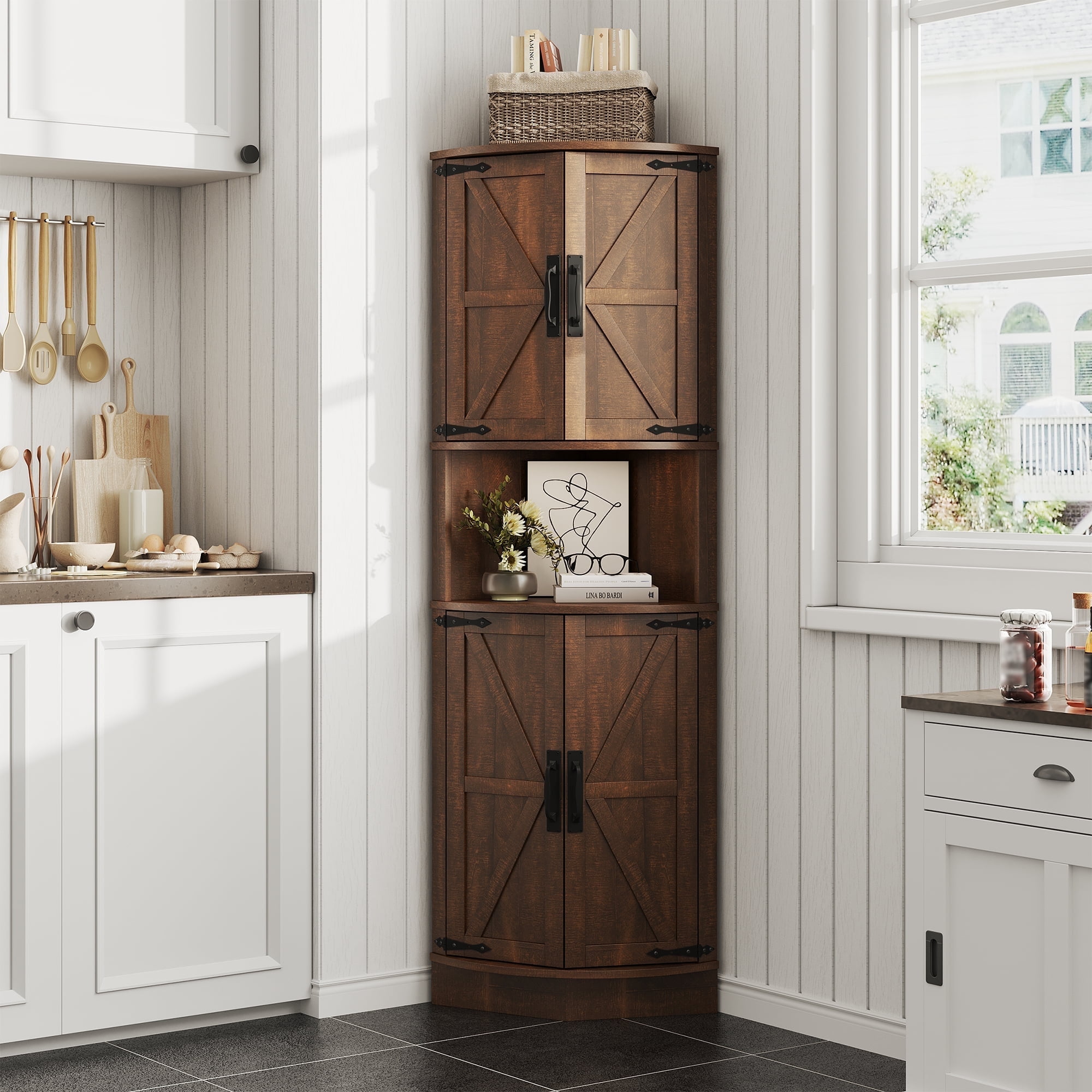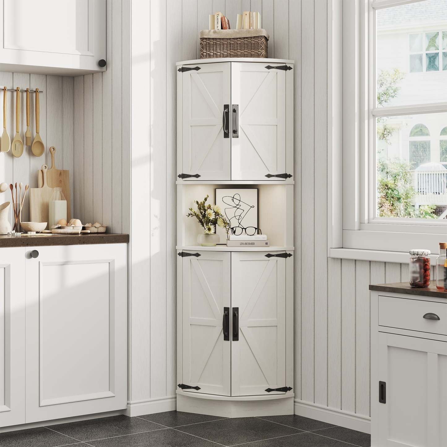 Vabches Farmhouse 64.8" Tall Corner Cabinet with 4 Doors and 5 Storage Shelves, Corner Storage Cabinet for Kitchen, Living Room, White