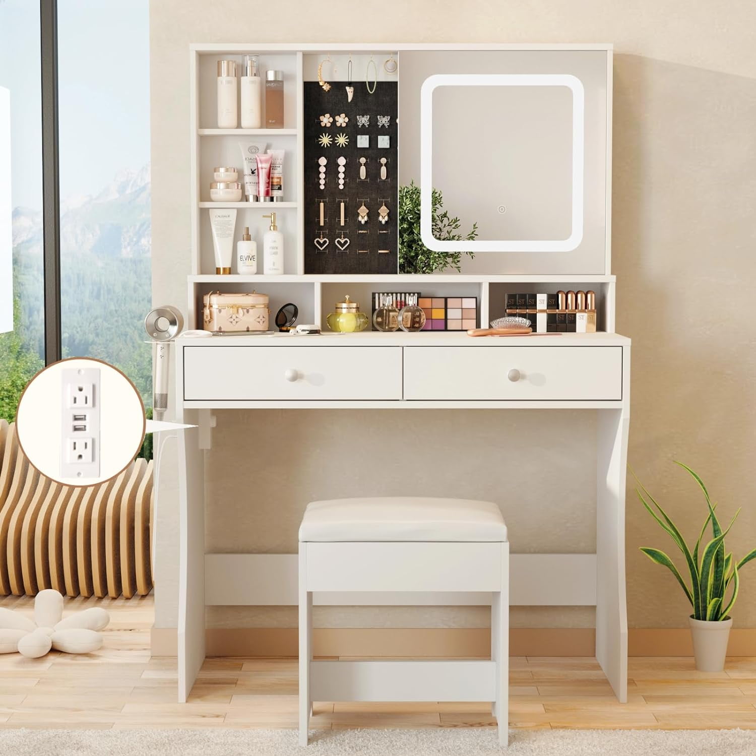 Vabches Vanity Set with 2 Drawers and LED Sliding Mirror with Charging Station and Hair Dryer Holder for Bedroom, White