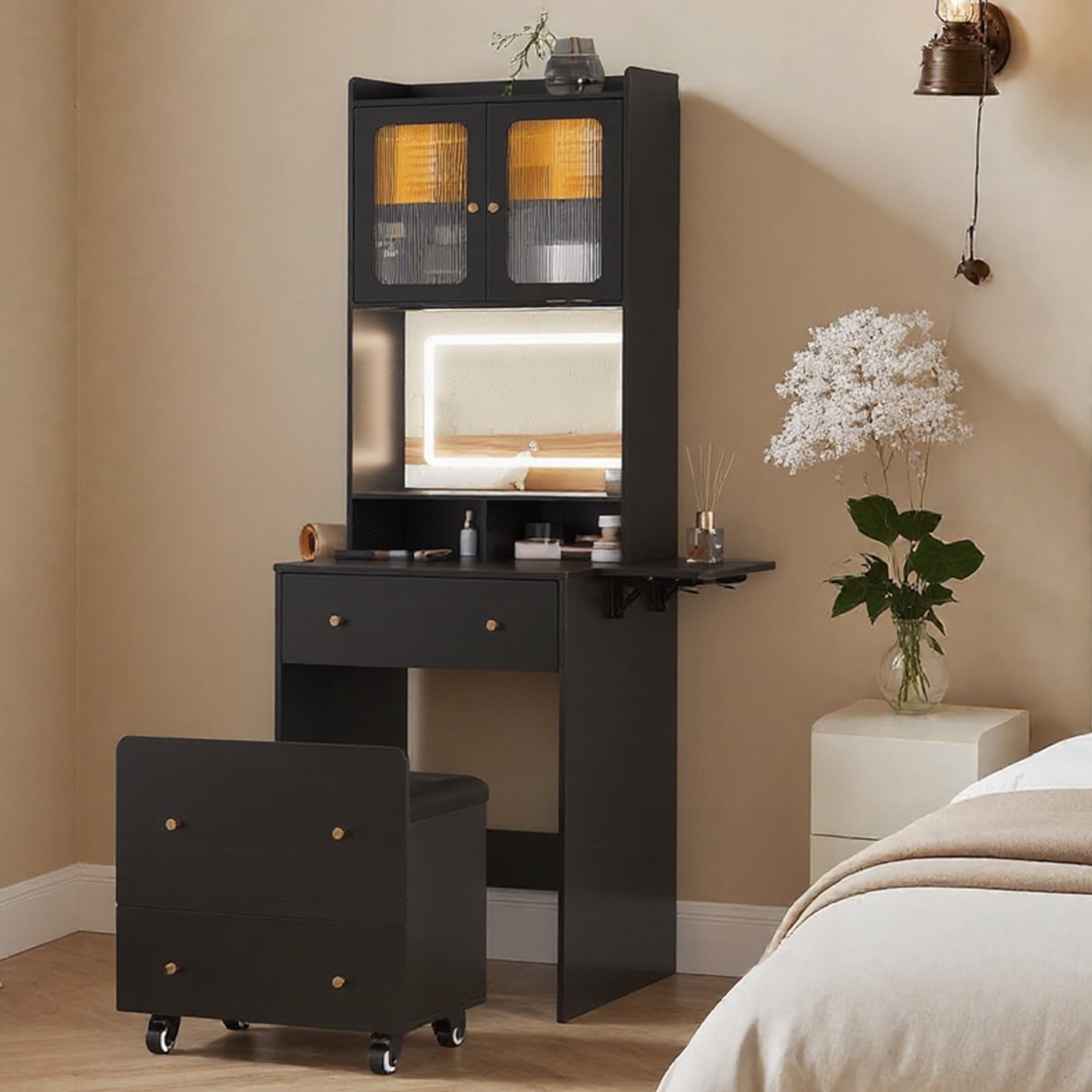 VEANERWOOD 70" H Vanity Desk Set for Small Spaces, Modern Vanity Set with Fold-up Panel and Hidden Stool, Small Dressing Table with LED Mirror
