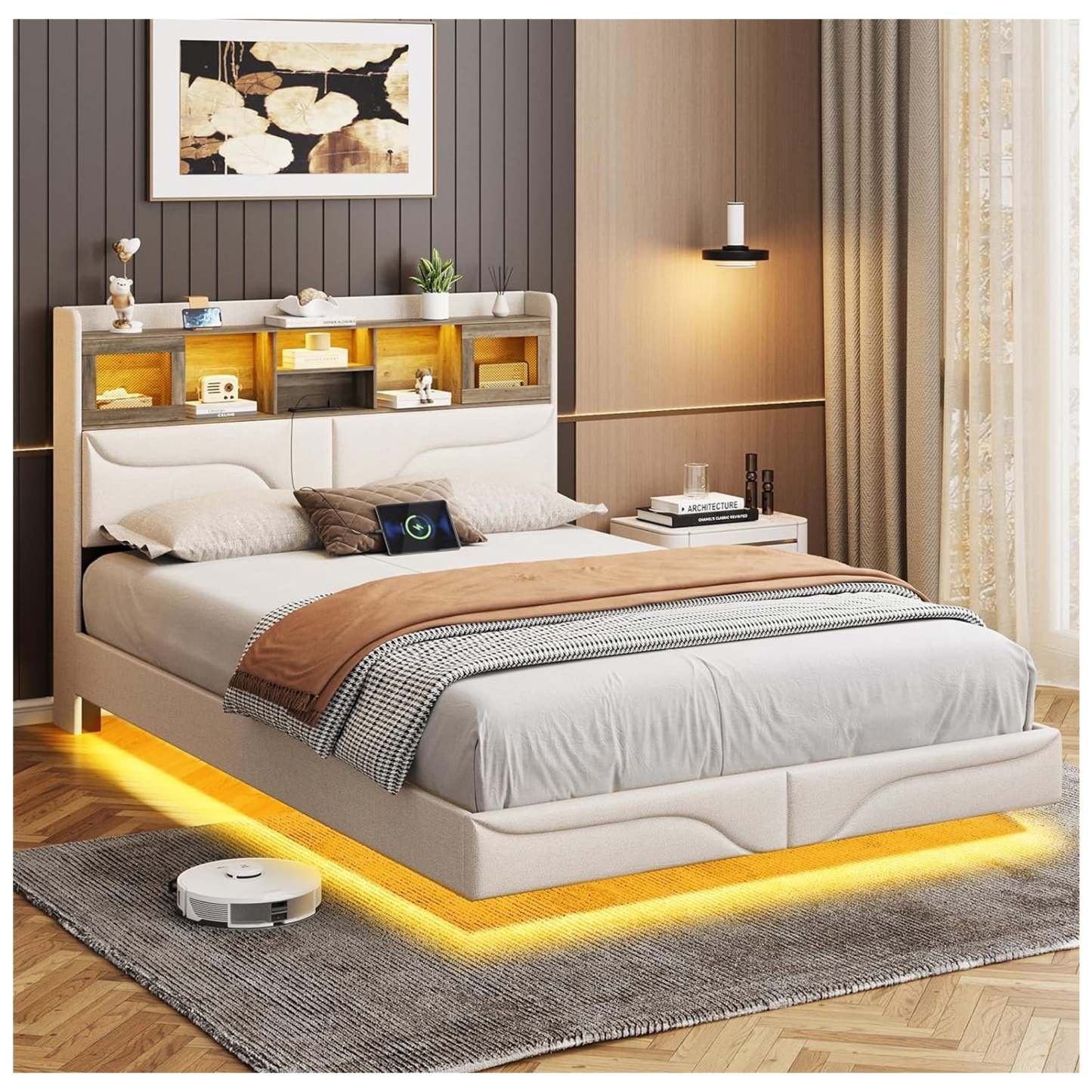 VEANERWOOD Floating Bed Frame Full Size Wood Platform Bed with LED Lights for Bedroom, Upholstered Bed Frame with Storage Bookcase Headboard, Charging Station, Sliding Door, No Box Spring